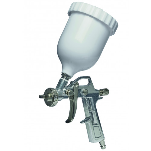 Verfspuitpistool met Vloeibeker - Werkdruk 3-4 bar - Inhoud reservoir: 0,6 L - Draaibaar mondstuk - Regelaar puntstraal / brede straal - Luchtdebietregelaar