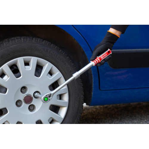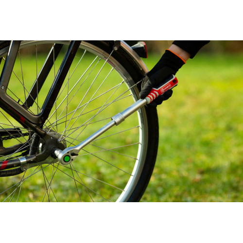 Van chroomstaal, aandrijving van chroom-molybdeenstaal, mat verchroomd, telescoopsteel in vijf standen verstelbaar van 460 • 600 mm, aandrijving via fijne vertanding met 72 tanden tot 360, korte naloop vanaf 5, handige eenhandschakelaar voor rechts-/linkshandig gebruik, met snel uitwerpen via drukknop, ergonomisch gevormde driecomponentenhandgreep, voor het los- en vastdraaien van schroeven en moeren