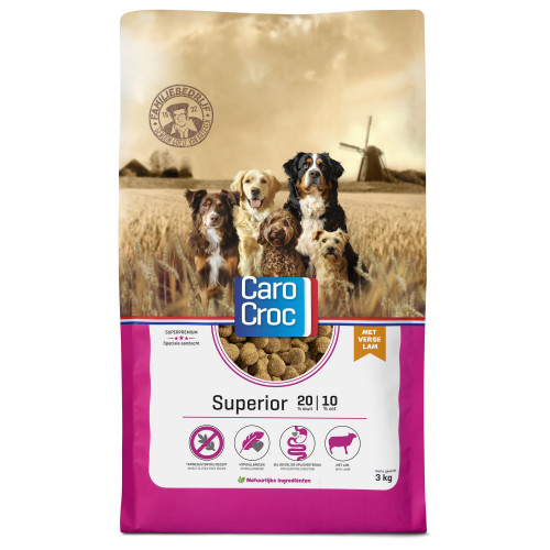 Geen enkele hond is hetzelfde. Je hebt honden die alles kunnen eten en je hebt honden die bij het minste geringste gevoelig reageren. Voor die honden is de CaroCroc Superior. Een smakelijke brok speciaal samengesteld om zorg te dragen voor een gezonde maag- en darmfunctie. Door de juiste toevoegingen draagt deze voeding ook bij aan het stimuleren van een goede vachtconditie.